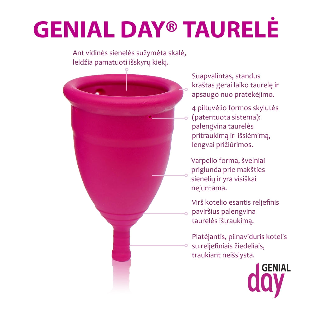 - Ar jautri šlapimo pūslė? Geriau rinktis mažesnę taurelę, nes ji spaudžia makšties sieneles ir galite norėti dažniau šlapintis. Nors moterys, turinčios šių bėdų, pastebi, kad GENIAL DAY® taurelė mažiau spaudžia sieneles, kadangi yra minkštesnė už silikonines taureles.