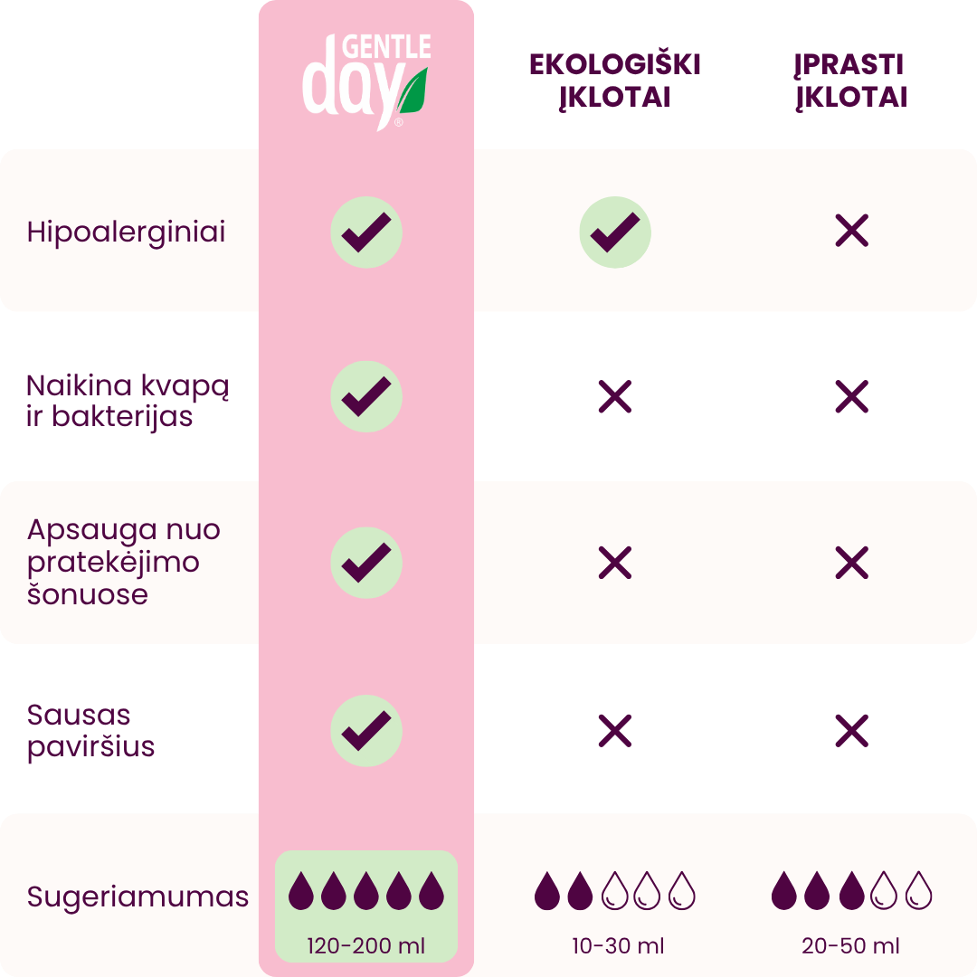 Vieninteliai išradimo patentą turintys ir ekologiškai sertifikuoti įklotai su anijonų juostele GENTLE DAY® - kuriami ir gaminami tam, kad padėtų moterims išvengti diskomforto ir odos sudirgimų menstruacijų metu ir kasdien.
