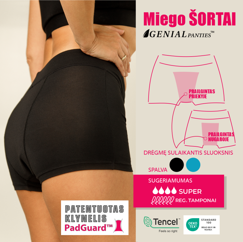 Visos GENIAL menstruacinės kelnaitės, įskaitant ir šortukų modelius, turi patentuotą klynelį, kuriame galima įklijuoti ir paslėpti paketo sparnelius. Jeigu nesijaučiate saugiai vien tik su kelnaitėmis, nešiokite jas kartu su papildomomis priemonėmis arba pradžioje išbandykite namuose.