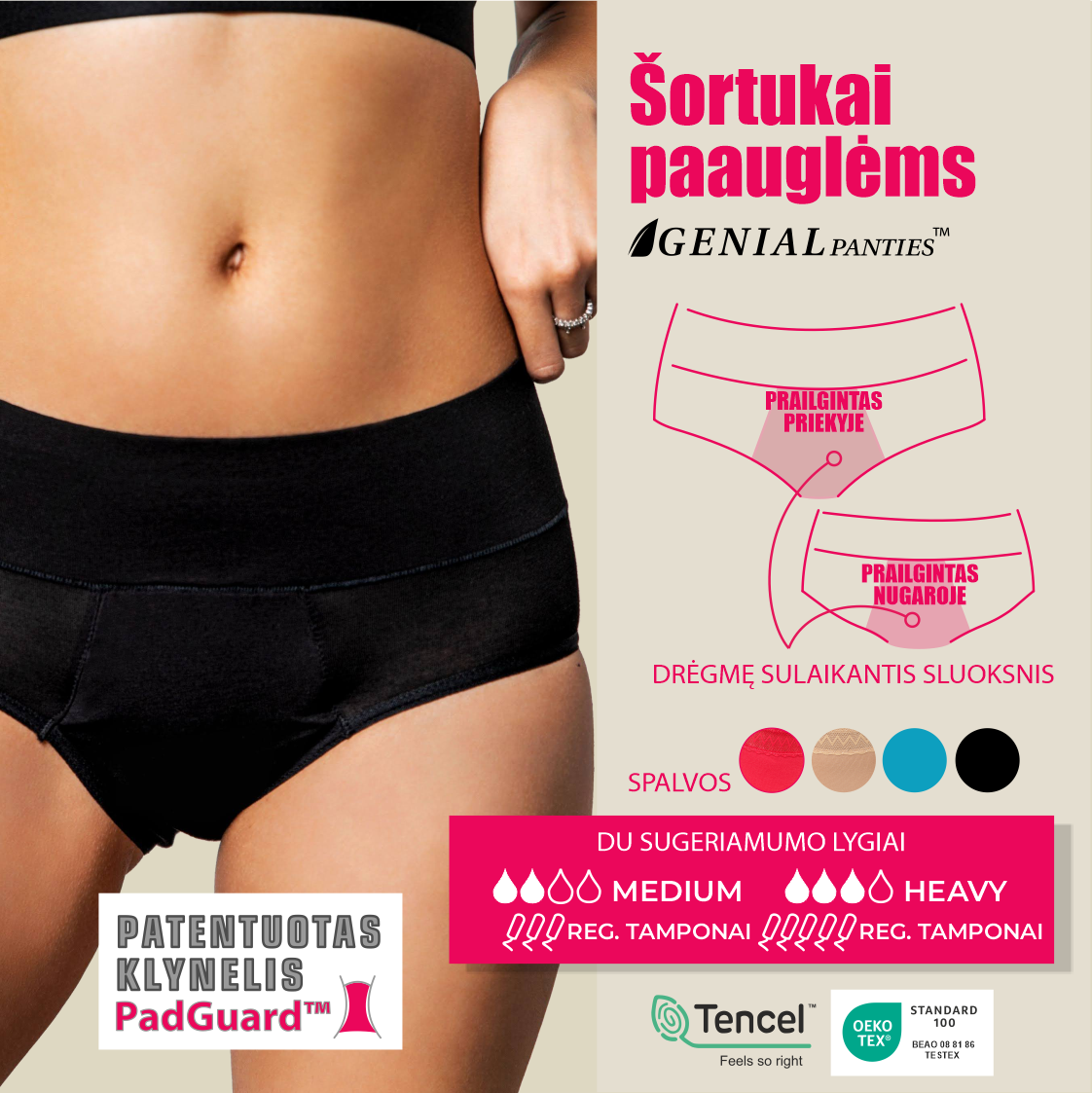 Visos GENIAL menstruacinės kelnaitės, įskaitant ir šortukų modelius, turi patentuotą klynelį, kuriame galima įklijuoti ir paslėpti paketo sparnelius. Jeigu nesijaučiate saugiai vien tik su kelnaitėmis, nešiokite jas kartu su papildomomis priemonėmis arba pradžioje išbandykite namuose.